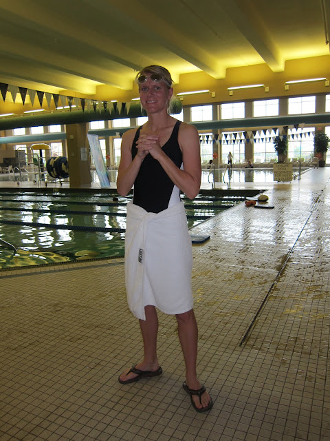 Me sporting my new swim suit and Speedo goggles (I found on sale, thank heavens... I already spend so much money on running workout stuff I could hardly justify throwing a new sport into the mix.)